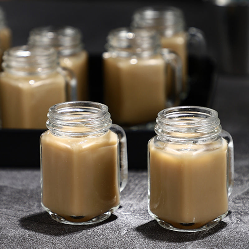Mini Mason Cup, glass material, highly transparent, mini shape. Paired with a tray, it's super convenient to walk away, and such cocktails can come by a dozen. 45ml, one sip, one cup, the standard capacity of the bullet cup, drink freely. Glass material, highly transparent, crystal clear, visual enjoyment. The handle shape is easy to take and feels comfortable. It is an indispensable accessory when using it. Wide range of uses, one cup is multi-purpose, suitable for cocktails/cold drinks, etc., to meet daily needs.
