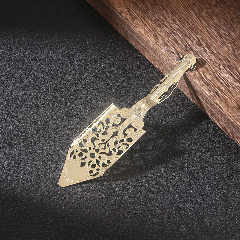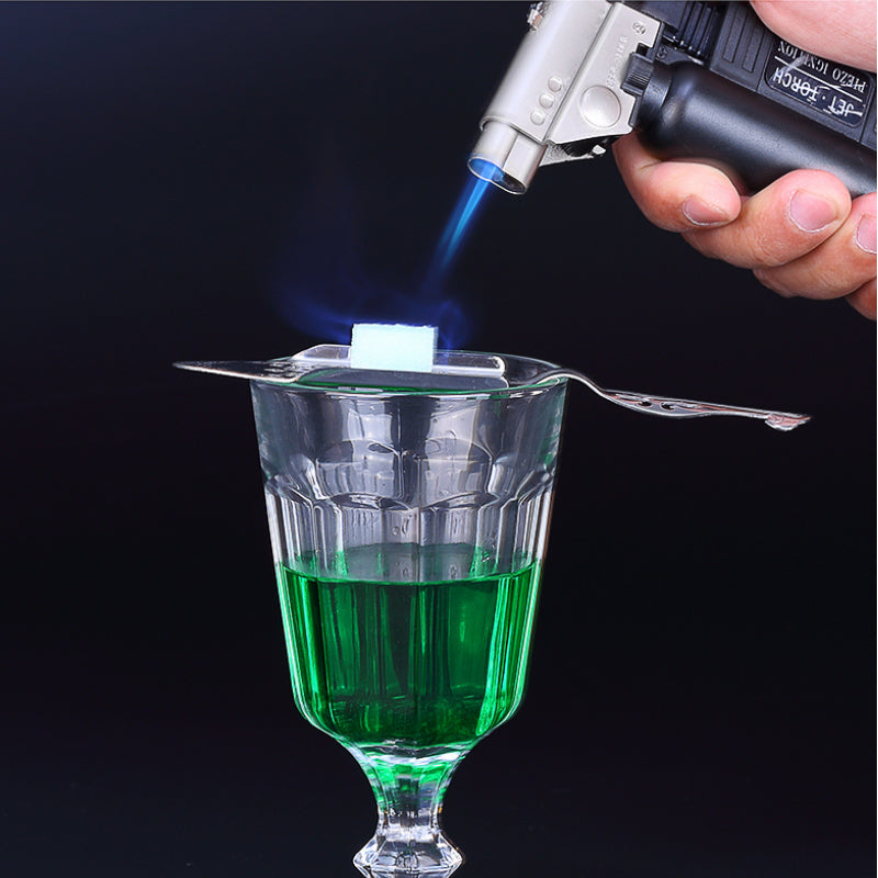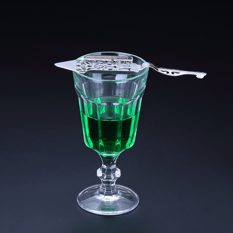 Traditional absinthe is prepared by pouring an ounce of absinthe into an absinthe glass, then placing a perforated absinthe spoon on the rim and topping with a sugar cube. This wormwood spoon grill design features wormwood and is probably the most sought after absinthe spoon for collectors.