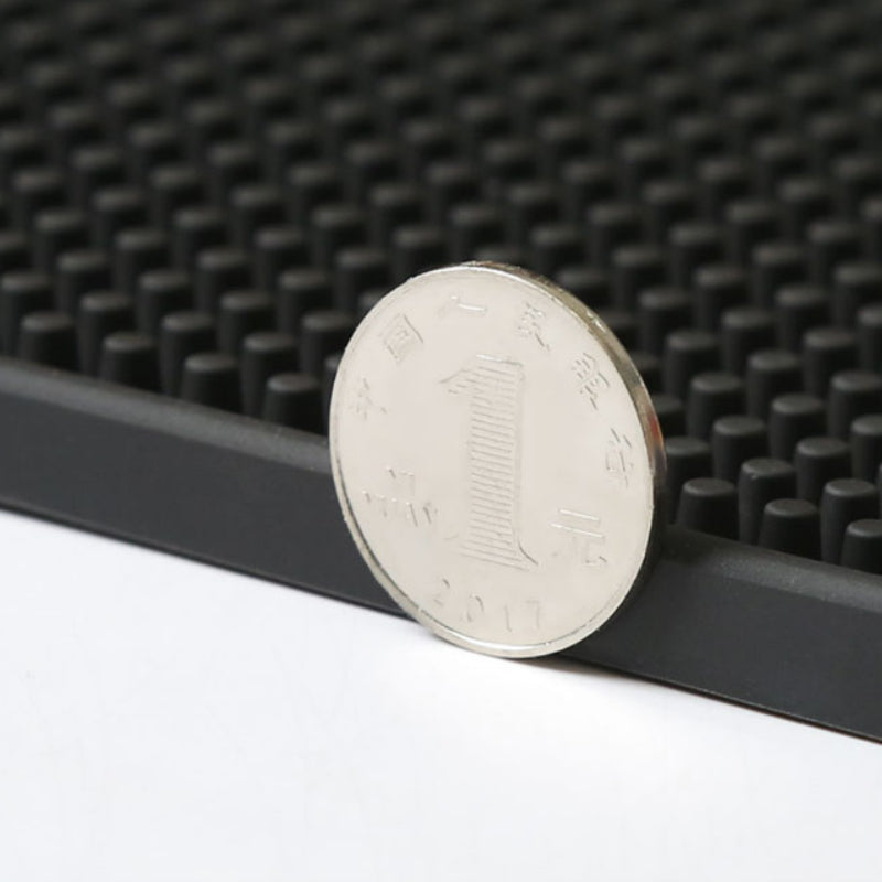 Made of extremely durable, solid, one-piece thermoplastic rubber, this mat provides optimal drainage and friction.Indented square on both ends of the bar mat serves well for placing a beer glass.The recessed surface provides more support to keep the glass from being easily tipped over.Coffee bar mat comes in black-colored exclusive design with a porous surface and handy knobs which help to keep the things placed upright while they dry.